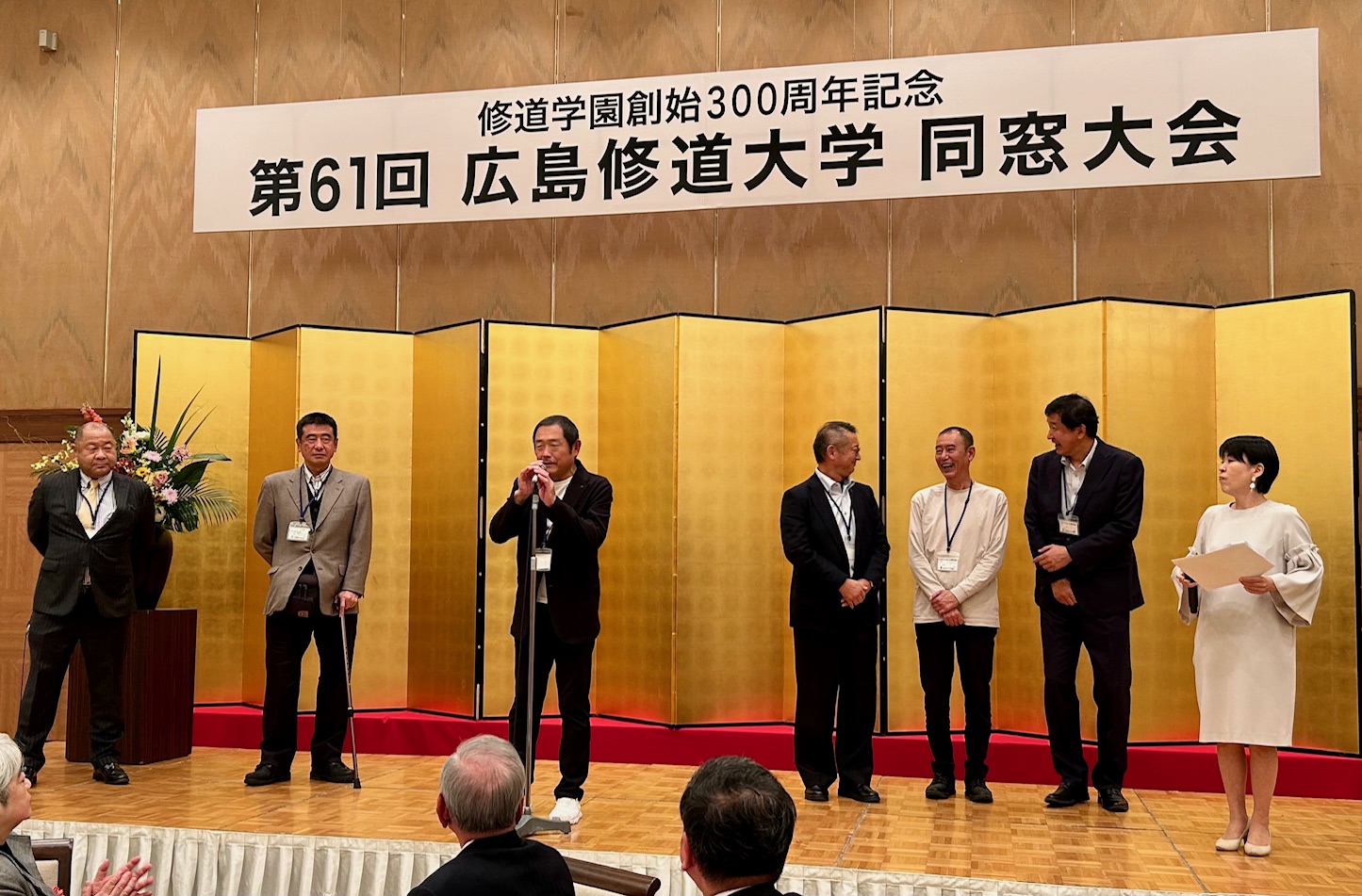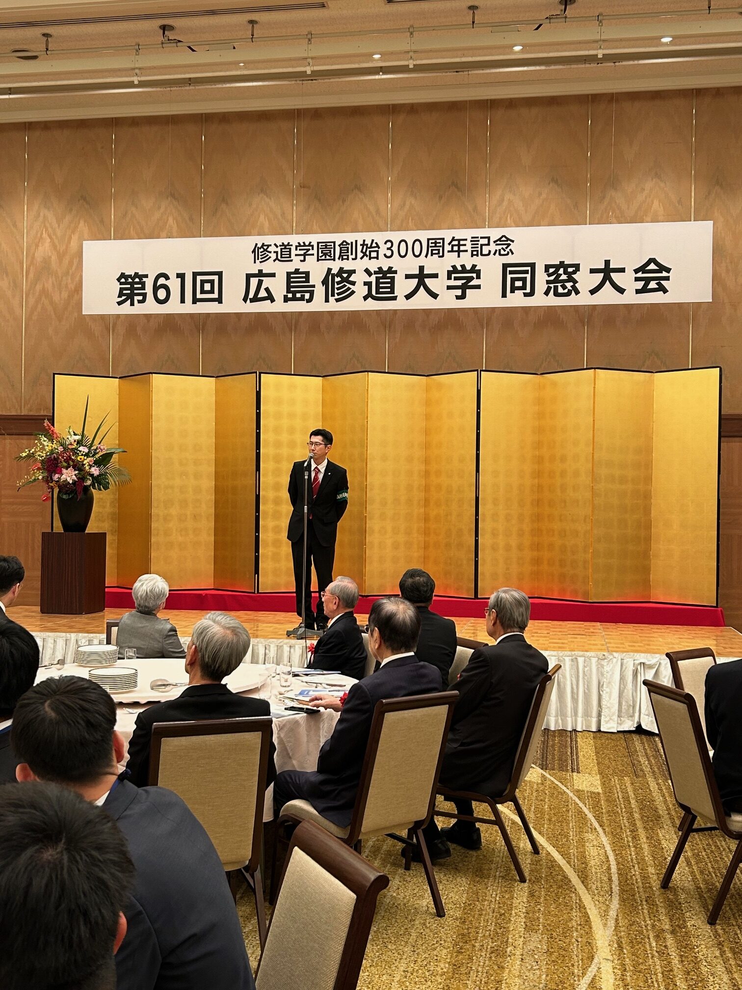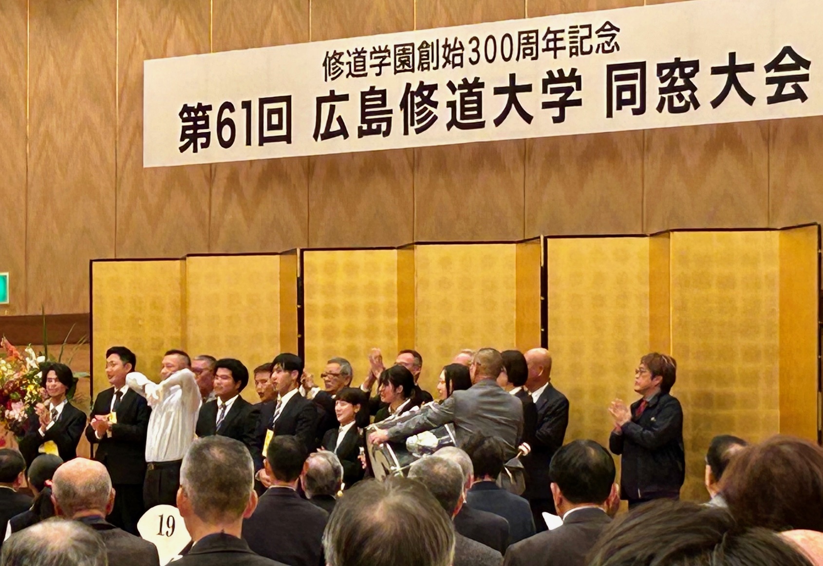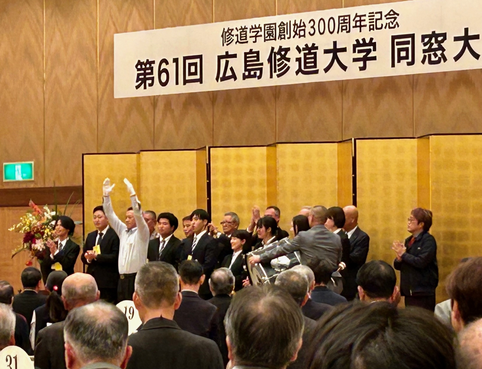 去る11月1日に第61回広島修道大学同窓大会をリーガロイヤルホテル広島にて開催いたしました。今年は修道学園創始300周年という大きな節目を迎えた記念の大会となりました。受付横には広島修道大学のあゆみを大きなパネルにて展示を行い、参加者の方にその歴史の大きさに触れていただく事が出来たと思います。昨年に引き続きパスマーケットでの事前決済予約にて受付もスムースに行われ、各団体の方々がそれぞれに集合いただきながら滞る事なくご入場いただく事ができました。当日は支部長会議も行われ全国各地の修大会の皆様方にもお集まりいただき盛大な会とする事ができました。来場者は約500名となり、事前予約だけでなく当日参加の方も多くおいでいただきました事で大変にぎやかな会となりました。多くの先輩方が同じ学び舎で研鑽を行い、社会でご活躍なさっている日常の中で同窓大会に帰ってきて、旧交を温める事でまた新たな活力となるような同窓大会になったと感じています。あらためて多くの同窓生の存在やご協力のおかげで同窓大会が成功裏に終了した事に対して深く御礼を申し上げます。