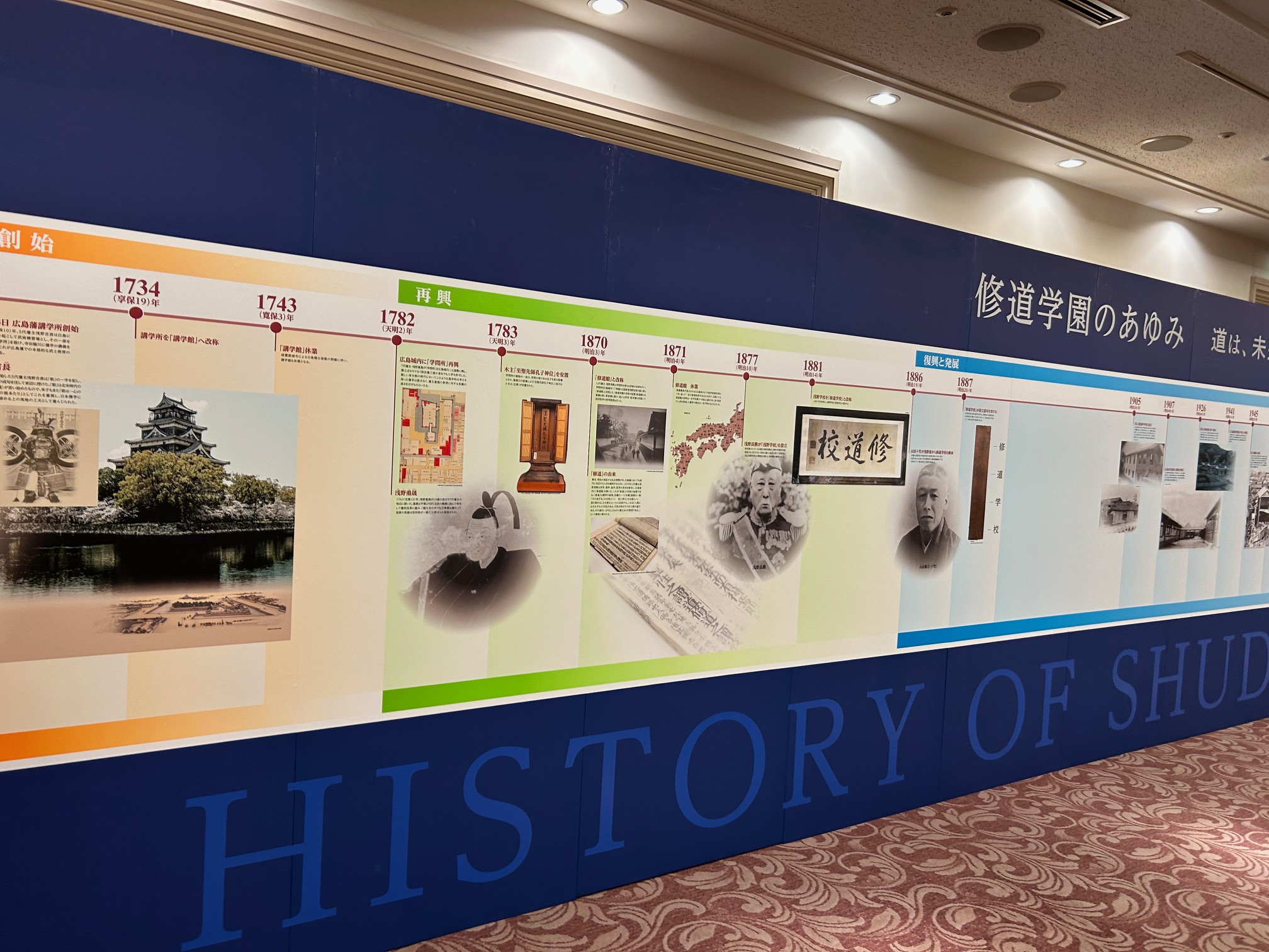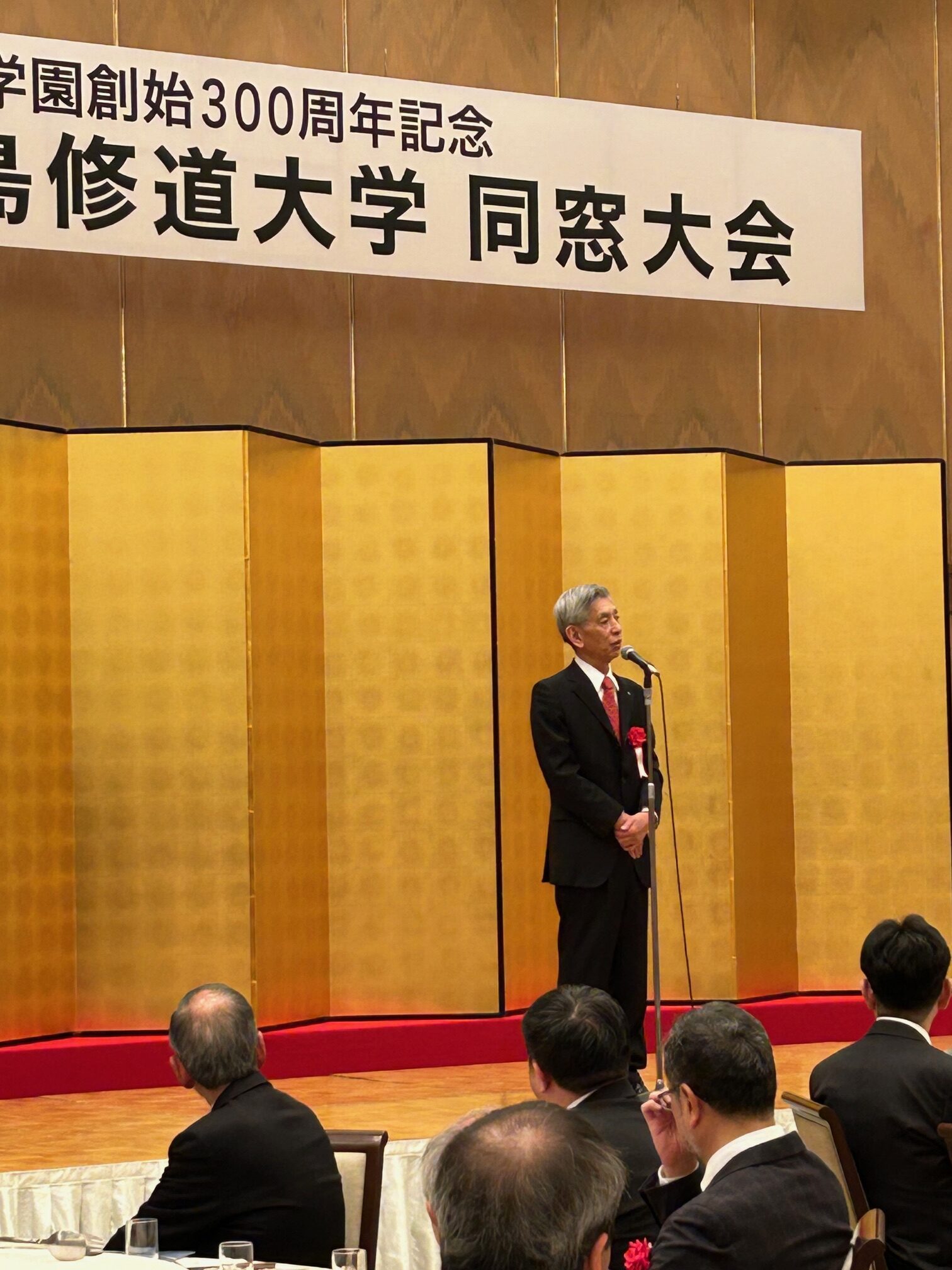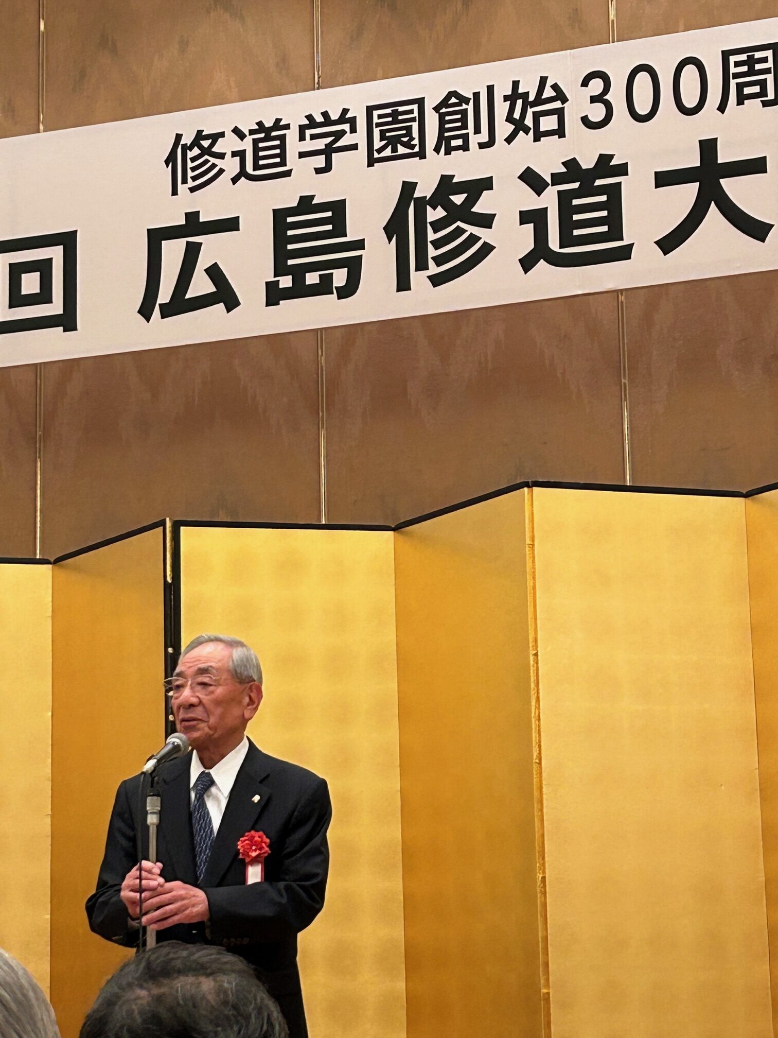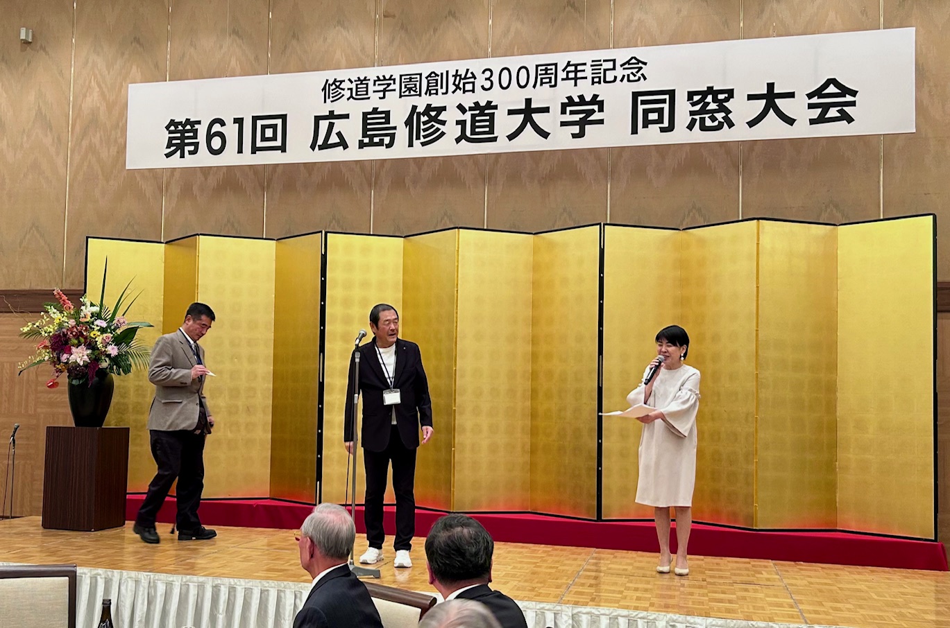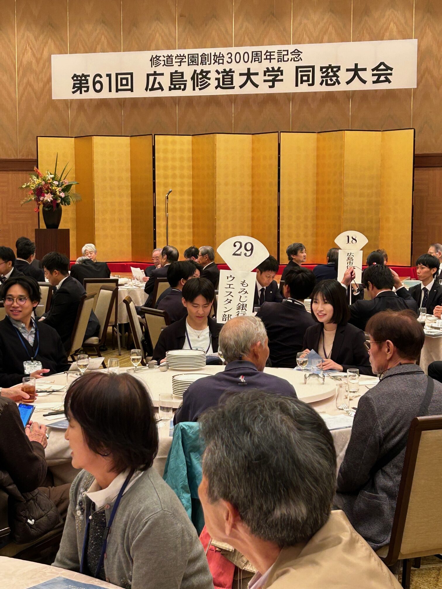 去る11月1日に第61回広島修道大学同窓大会をリーガロイヤルホテル広島にて開催いたしました。今年は修道学園創始300周年という大きな節目を迎えた記念の大会となりました。受付横には広島修道大学のあゆみを大きなパネルにて展示を行い、参加者の方にその歴史の大きさに触れていただく事が出来たと思います。昨年に引き続きパスマーケットでの事前決済予約にて受付もスムースに行われ、各団体の方々がそれぞれに集合いただきながら滞る事なくご入場いただく事ができました。当日は支部長会議も行われ全国各地の修大会の皆様方にもお集まりいただき盛大な会とする事ができました。来場者は約500名となり、事前予約だけでなく当日参加の方も多くおいでいただきました事で大変にぎやかな会となりました。多くの先輩方が同じ学び舎で研鑽を行い、社会でご活躍なさっている日常の中で同窓大会に帰ってきて、旧交を温める事でまた新たな活力となるような同窓大会になったと感じています。あらためて多くの同窓生の存在やご協力のおかげで同窓大会が成功裏に終了した事に対して深く御礼を申し上げます。
