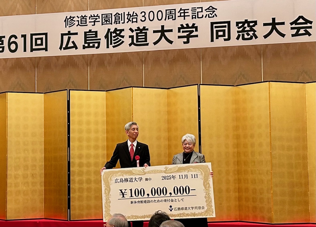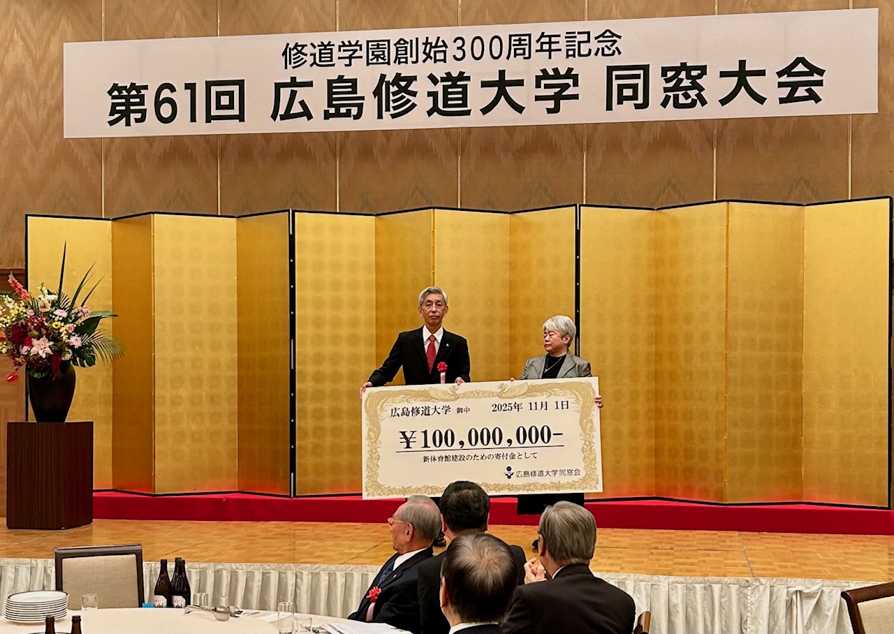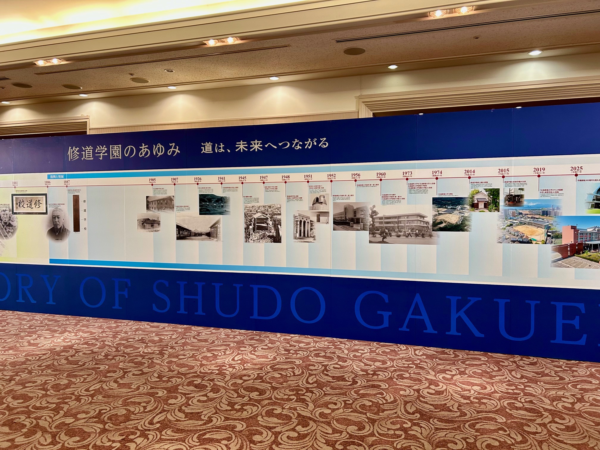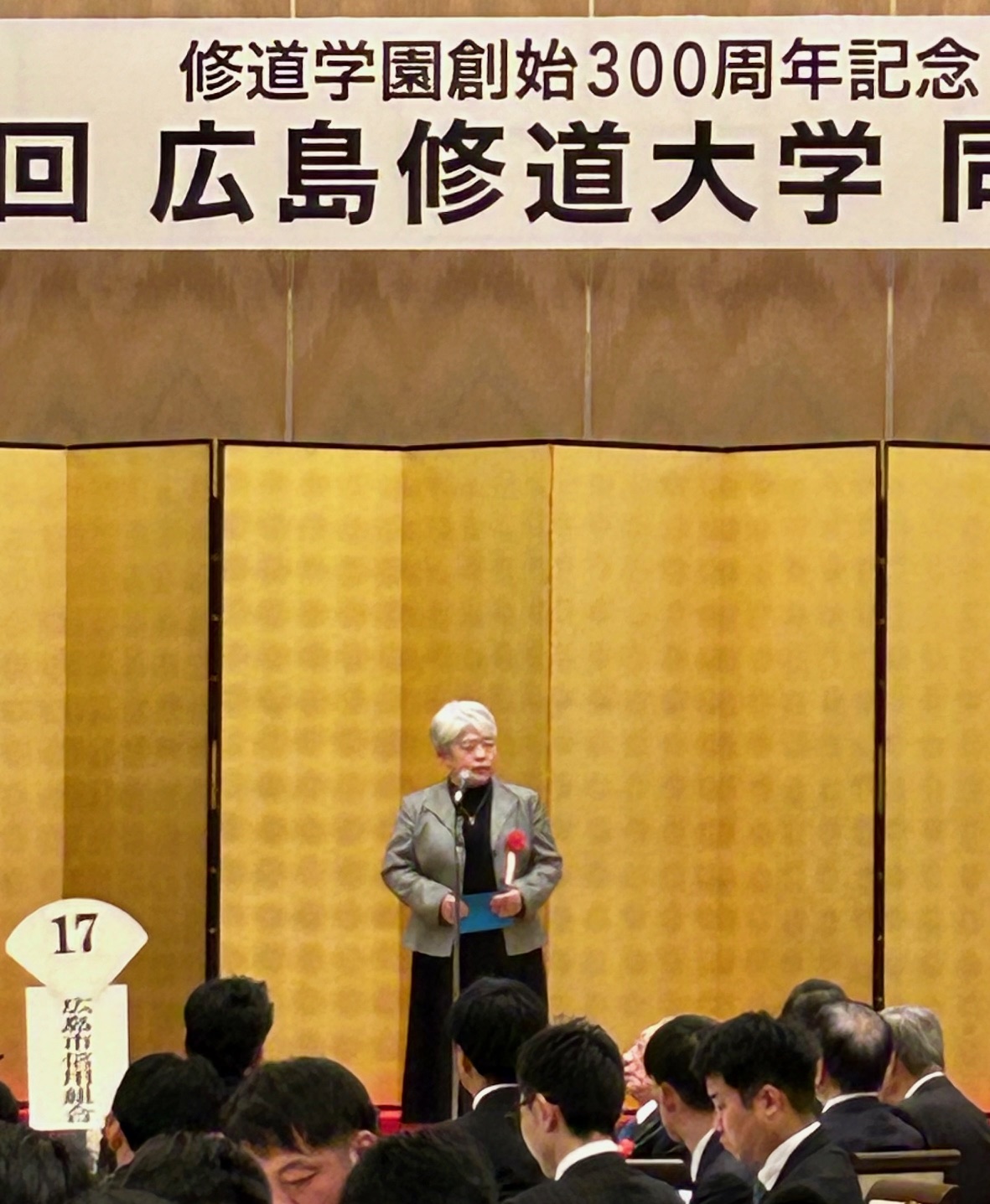 去る11月1日に第61回広島修道大学同窓大会をリーガロイヤルホテル広島にて開催いたしました。今年は修道学園創始300周年という大きな節目を迎えた記念の大会となりました。受付横には広島修道大学のあゆみを大きなパネルにて展示を行い、参加者の方にその歴史の大きさに触れていただく事が出来たと思います。昨年に引き続きパスマーケットでの事前決済予約にて受付もスムースに行われ、各団体の方々がそれぞれに集合いただきながら滞る事なくご入場いただく事ができました。当日は支部長会議も行われ全国各地の修大会の皆様方にもお集まりいただき盛大な会とする事ができました。来場者は約500名となり、事前予約だけでなく当日参加の方も多くおいでいただきました事で大変にぎやかな会となりました。多くの先輩方が同じ学び舎で研鑽を行い、社会でご活躍なさっている日常の中で同窓大会に帰ってきて、旧交を温める事でまた新たな活力となるような同窓大会になったと感じています。あらためて多くの同窓生の存在やご協力のおかげで同窓大会が成功裏に終了した事に対して深く御礼を申し上げます。