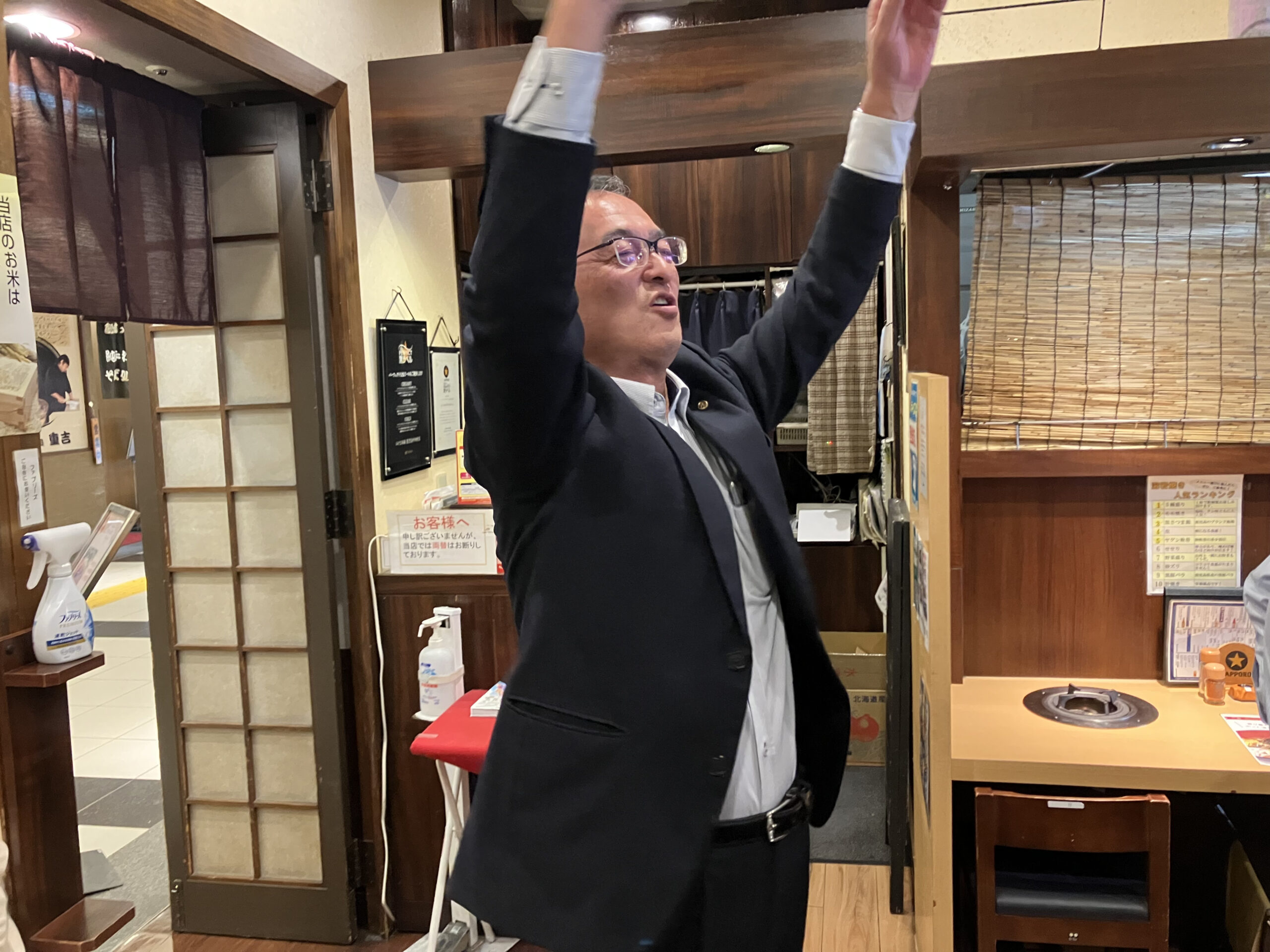 また、本部からのもみじ饅頭や参加者の方からのお土産などの景品が準備され、あみだくじ大会で大いに盛り上がり、最後は私の一つ先輩にあたる福光元応援団長の演武とともに、学生歌を斉唱(懐かしの「広島修道大学学生歌~einsアインス・zweiツヴァイ・dreiドゥライ」)して締めくくりました。